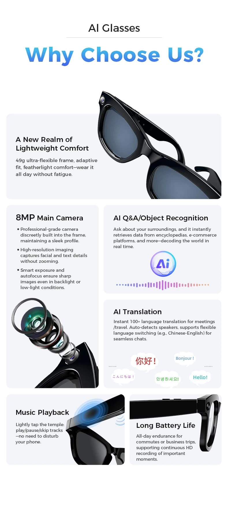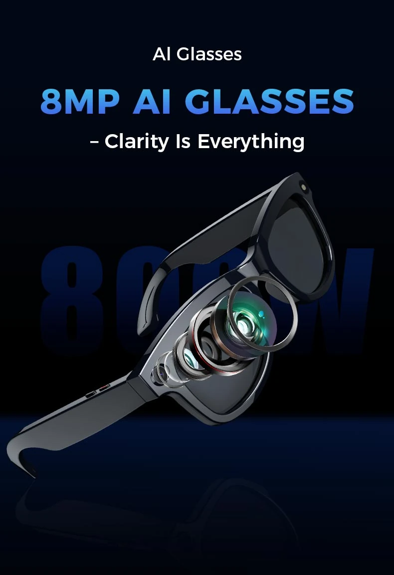 New Smart AI Glasses: 8-Megapixel Camera with Image Stabilization, AI Translation, Music Playback, and Bluetooth