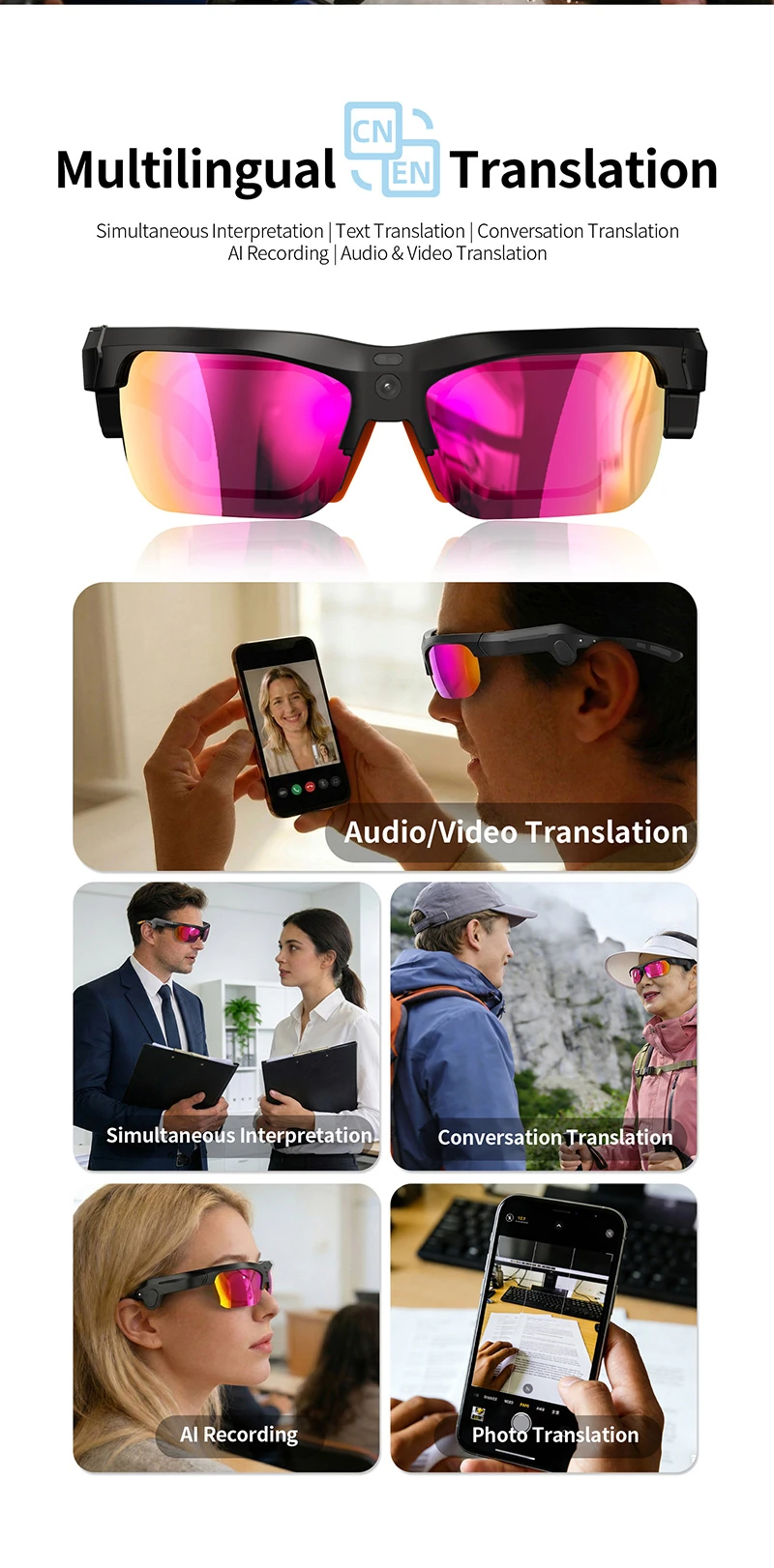 Outdoor Cycling Sunglasses with 8-Megapixel Camera, Smart Translation, Wi-Fi Transfer, and Image Recognition