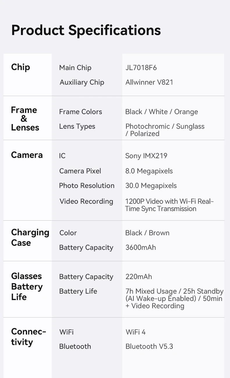 X01 Smart Glasses: 8-megapixel camera, charging case, audio and video recording, image stabilization, AI assistant, translation, and office features